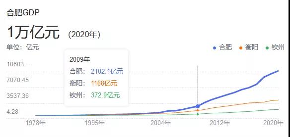 2009年之前,合肥連續(xù)幾年GDP增長都在300億元上下,而到了2010年,GDP增長直接達(dá)到了800億上下,比之前兩年的增長總量之和還多。