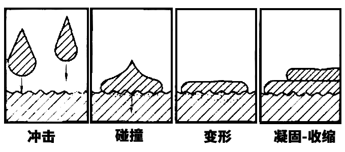 熱噴涂技術(shù)工藝方法很多,但無論何種工藝方法,噴涂過程中形成涂層的原理和涂層結(jié)構(gòu)基本一致。熱噴涂形成涂層的過程一般經(jīng)歷四個階段:噴涂材料加熱溶化階段、霧化階段、飛行階段、碰撞沉積階段。