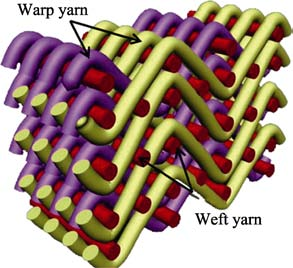 SiCf/SiC 復合材料的制造方法為有機前驅(qū)體浸漬熱解( Polymer Impregnation and Pyrolysis, PIP),其預制體編織方式為 2.5D 編織, SiC 纖維采用彎交淺聯(lián)方式編織,其結(jié)構如圖 1 所示。預制體的緯向纖維束基本為平直纖維束,無任何擾動,而經(jīng)向纖維束以緯向纖維束為基軸,呈 S 形連續(xù)擾動分布。預制體的尺寸約為 200 mm×150 mm×30 mm,編織好后采用CVD 法制備 PyC 界面層,然后利用主鏈含 Si 和 C 的有機前驅(qū)體溶液浸漬預制體,經(jīng)交聯(lián)固化成形后,高溫燒結(jié)成 SiC 基體。復合材料拉伸試樣尺寸為 ?25 mm×5.5 mm, 試樣的拉伸方向平行于厚度( 5.5 mm) 方向。為了更好地考核涂層的結(jié)合性能,加工后的試樣5.5 mm方向平行于預制體的徑向, ?25 mm 的面平行于預制體的緯向。