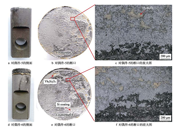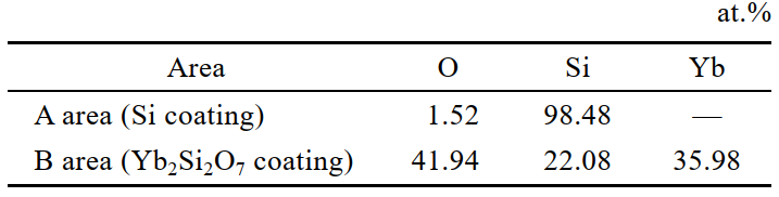 與 Si 涂層拉伸原因相似, Si/Yb2Si2O7 雙層涂層與 SiCf/SiC 復材結(jié)合強度高的原因主要為:1) SiCf/SiC復材沿拉伸方向強度較高, Si 層與復合材料結(jié)合強度高;2)本文采用的真空等離子噴涂,有利于減少涂層內(nèi)的微觀缺陷,從而提高了涂層與基體之間的黏結(jié)強度以及涂層自身的內(nèi)聚強度;3) Yb2Si2O7 的熱膨脹系數(shù)為 3.3×10–6~5.2×10–6 ℃ –1,與 Si、 SiCf/SiC 的熱膨脹系數(shù)相近;4) Si 層與 Yb2Si2O7 層的化學相容性好,有利于 Yb2Si2O7 在 Si 涂層表面的鋪展和結(jié)合。
