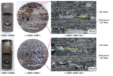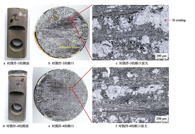 Si 涂層拉伸試驗后的宏觀與斷面形貌如圖 10 所示。對偶件示。對偶件-3(見圖 10a)側(cè)面上方?jīng)]有明顯厚度的SiCf/SiC 復合材料或 Si 涂層,對偶件-4(見圖 10d)側(cè)面上方粘有試樣。從對偶件側(cè)面觀察可知,加有Si 涂層的復合材料在拉伸過程中, 斷裂位置主要在涂層或者涂層與復合材料的界面位置。在 2 個斷面的宏觀斷口(見圖 10b、 e)均可以看到條狀紋路和粘結(jié)膠,由于粘有 Si 涂層,粘結(jié)膠的顏色較淺。在斷口放大形貌(見圖 10c、 f)觀察到 Si 層、大量絲狀緯向 SiC 纖維和灰黑色 SiC 基體。以上觀察結(jié)果表明,含 Si 層的 SiCf/SiC 復材在拉伸過程中,部分 Si 層、復材的 SiC 基體、粘結(jié)膠都發(fā)生了斷裂,且復材表面部分緯向的 SiC 纖維沿拉伸方向被拉開。