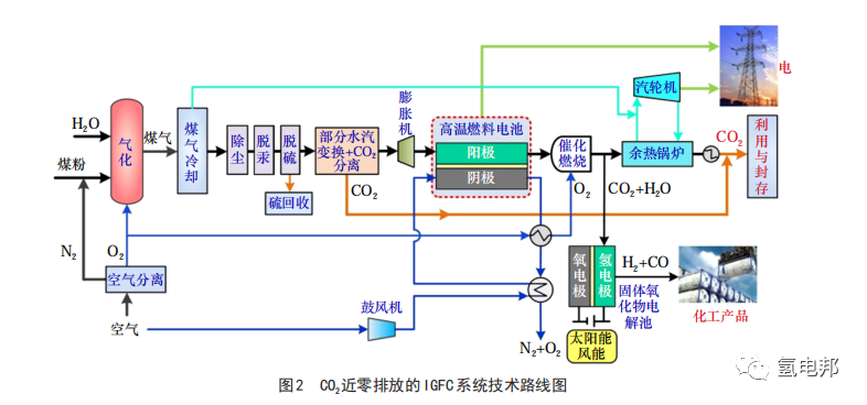 在固體氧化物燃料電池技術(shù)應(yīng)用場景方面,IGFC 技術(shù)有助于實現(xiàn)煤炭的清潔高效利用,是煤炭領(lǐng)域的變革性技術(shù)。為推進(jìn)IGFC相關(guān)技術(shù)攻關(guān)和工程示范,科學(xué)技術(shù)部在2017年立項了國家重點研發(fā)計劃 “CO2近零排放的煤氣化發(fā)電技術(shù)”,由國家能源集團(tuán)牽頭,聯(lián)合中國礦業(yè)大學(xué)(北京)、中國華能集團(tuán)清潔能源技術(shù)研究院有限公司、清華大學(xué)等單位組成“產(chǎn)學(xué)研”攻關(guān)團(tuán)隊,其核心任務(wù)是開發(fā)高溫固體氧化物燃料電池和固體氧化物電解池技術(shù),建成 CO2近零排放的 IGFC 示范工程,項目總體技術(shù)路線如圖2所示。IGFC系統(tǒng)一般由煤氣化凈化、高溫燃料電池發(fā)電、余熱回收及CO2捕集和封存等子系統(tǒng)構(gòu)成,其中高溫燃料電池發(fā)電技術(shù)是制約IGFC發(fā)展的關(guān)鍵技術(shù)。項目組目前已開發(fā)了固體氧化物燃料電池電堆和IGFC測試平臺,已實現(xiàn)了20千瓦級IGFC發(fā)電系統(tǒng)試車,下一步將依托已有技術(shù)開展100千瓦級IGFC發(fā)電系統(tǒng)示范 [12]。目前,國內(nèi)IGFC仍處于起步階段,煤氣凈化提純技術(shù)、高溫燃料電池技術(shù)、系統(tǒng)耦合控制技術(shù)等相關(guān)技術(shù)研究正逐步開展。高溫固體氧化物燃料電池技術(shù)是制約IGFC發(fā)展的關(guān)鍵技術(shù),目前,國內(nèi)的固體氧化物燃料電池技術(shù)尚未完全成熟,一方面應(yīng)加強(qiáng)基礎(chǔ)研究,另一方面要重點開展關(guān)鍵技術(shù)攻關(guān),降低成本,提高壽命。