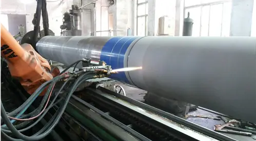 高溫噴涂工藝是將熔融狀態(tài)的噴涂材料,通過高速氣流,使其霧化,噴射在被凈化及粗化的零件表面上,形成噴涂層的一種表面加工方法。噴涂合金顆粒通過受熱加速后,撞擊到基體表面形成涂層的過程中,熔融狀態(tài)的或高塑性狀的粉末顆粒,以一定的飛行速度撞擊在基體上與基體相互作用,是形成涂層的重要階段 [1] 。