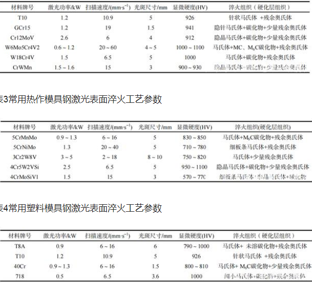 采用激光淬火技術對模具處理時,通常根據模具的形狀特點和使用要求在指定區(qū)域內進行淬火。激光淬火后,模具表面的耐磨性較常規(guī)淬火、回火處理有顯著提高,從而延長了模具的有效使用時間。例如福建農林大學徐洪煙等研究了經激光淬火后模具材料的性能變化,結果表明,模具表面組織的改變使其耐磨性增強,淬火后的殘余應力也使 模具材料的抗疲勞性顯著提高。樊湘芳等對 GCr15 鋼沖模的母模進行了激光表面淬火,試驗后,其表面硬度獲得提高,增強了母模型腔的抗沖擊能力,使模具壽命提高了 20%以上。常見的模具有冷作模、熱作模及塑料模,對于不同材料的模具, 經激光淬火后,組織性能有所不同。用于加工的冷作模具材料都屬于高碳鋼,提高耐磨性和硬度是表面淬火的主要目的。經激光淬火后的組織和性能見表 2。用于加工的熱作模具材料都屬于中碳鋼,表面淬火的目的有提高高溫耐磨性、耐熱疲勞性、抗氧化性,但是并不要求很高的表面硬度。經激光淬火后的組織和性能見表3。 用于加工的塑料模具材料范圍較廣,從結構鋼到工具鋼,從碳素鋼到合金鋼。塑料模具對其表面的粗糙度要求很嚴格,但不要求很高的表面硬度, 因此激光表面淬火處理多用于一些囊塊,其目的是提高囊塊的硬度。經激光加熱表面淬火后的組織和性能見表4。