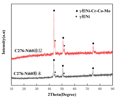 C276-Ni60 粉末和涂層的 XRD 圖譜如圖 2 所示, 結(jié)合表 1 和表 2 噴涂粉末的成分可以表明,C276-Ni60 粉末和涂層的主要物相為 γ 相的 Ni-Cr-Co-Mo, 這表明等離子焰流的溫度并沒有明顯改變 C276-Ni60 粉末的相組成。涂層和粉末實際都是以鎳基為主的 γ 相,這可能是由于噴涂的合金粉末中 Ni60 占比較低,未檢測到明顯的不同相。同時噴涂的粉末中擁有含量較高的 Cr 和 Mo 元素,因此主要物相為 γ 相的鎳基合金的涂層抗腐蝕性較強。