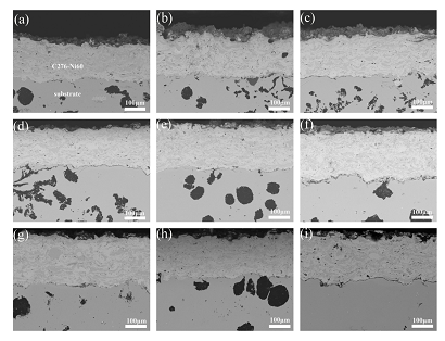 9 種不同 APS 工藝參數(shù)制備的 C276-Ni60 涂層微觀組織結(jié)構(gòu)如圖 3 所示。從圖 3 中可以看出,基體和涂層結(jié)合的結(jié)合面處形成的是不規(guī)則的交錯咬合,其結(jié)合方式為機械結(jié)合。此外,涂層中還存在著少量不同大小、形狀的孔洞及未熔粉末顆粒。