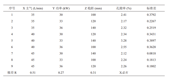 正交實驗制備的涂層孔隙率及其標準差如表4所示,5號工藝涂層的孔隙率最大,數(shù)值為3.28%;7 號工藝涂層的孔隙率最小,數(shù)值為 2.12%。