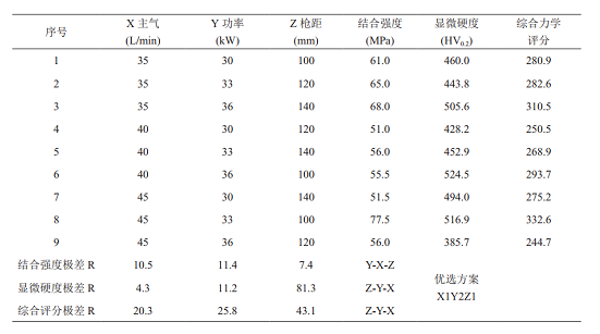 其中:K1 表示結(jié)合強度,最大值 77.5 MPa是 8 號工藝的結(jié)合強度,最小值 51 MPa 是 4 號工藝的結(jié)合強度。K2 表示顯微硬度,最大值 524.5HV0.2 是 6 號工藝的顯微硬度,385.7 HV0.2 是 9 號工藝的顯微硬度。