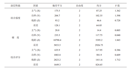 影響涂層質(zhì)量的力學性能指標主要包括結(jié)合強度和顯微硬度。表 5 為不同工藝 C276-Ni60 涂層的結(jié)合強度和顯微硬度,采用極差法來分析,涂層的力學性能通過計算綜合加權評分的方法來評價。根據(jù)極差的大小,可以判斷出各個因素對涂層力學性能影響的主次順序,極差越大,則說明該因素對性能的影響越大。另根據(jù)方差法可以定量分析各個因素對涂層質(zhì)量的影響程度,彌補直觀分析的不足,并通過 F 值來檢驗。