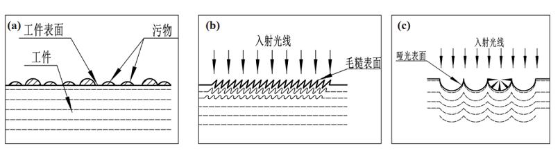 圖 1 噴砂粒子的形狀對工件表面形貌的影響:(a) 噴砂處理前;(b) 鋒利邊緣的不規(guī)則粒子處理后;(c) 丸狀粒子處理后
