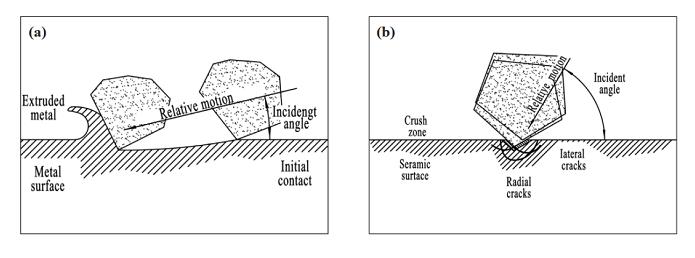 圖 2 噴砂型沖蝕磨損機理:(a) 小角度沖蝕;(b) 大角度沖蝕