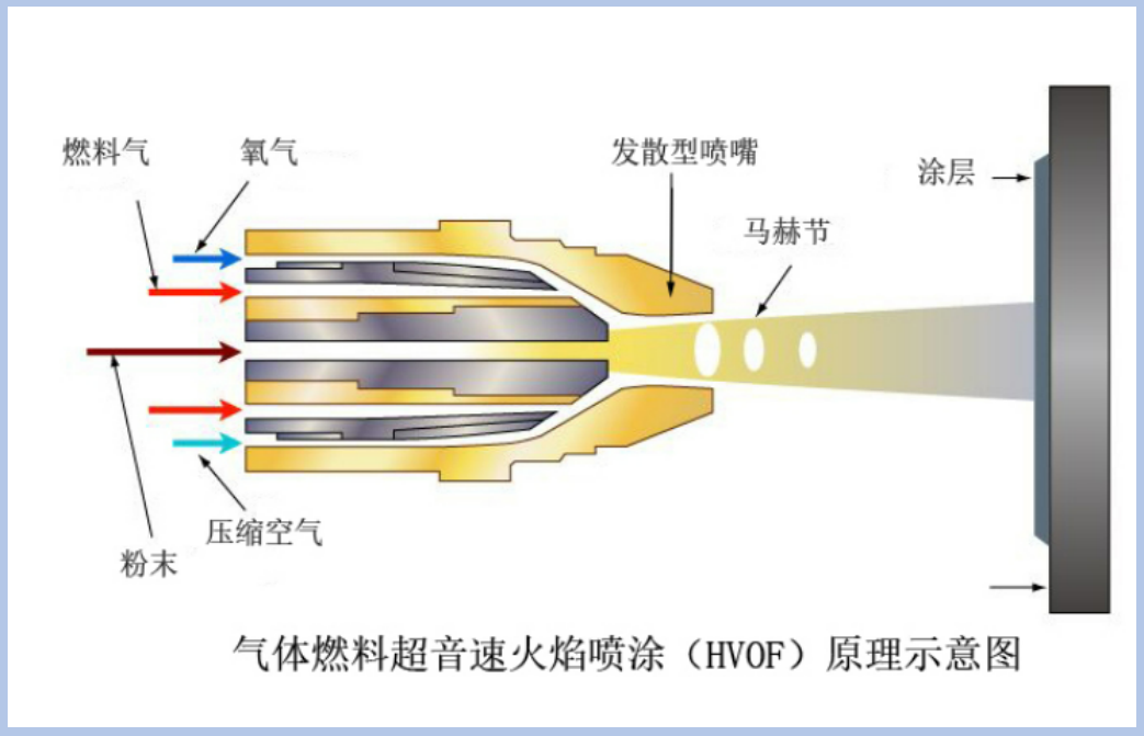 燃料(丙烷、丙烯、氫氣、乙炔、煤油等)和氧氣在噴涂槍燃燒室內混合后連續(xù)燃燒,導入的微細噴涂粉末材料(可以用高壓軸向送入或從噴射管側面送入)隨焰流從細長頸部射出并加熱熔融,以高速撞擊零件表面,形成涂層。涂層質量遠優(yōu)于傳統(tǒng)的火焰噴涂、電弧噴涂和等離子噴涂涂層。超聲速火焰噴涂粒子的飛行速度高,可形成致密、結合強度高的涂層,火焰溫度不超過3000℃,粉末在火焰中被加熱的時間短,因此噴涂材料的相變、氧化和分解受到抑制,特別適合于噴涂碳化物和硼化物等金屬陶瓷材料;噴涂效率高,噴涂距離可在較大范圍內變動而不影響噴涂質量;氧氣消耗量大,成本較高。