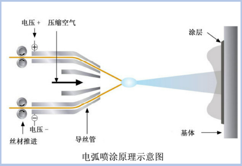 電弧噴涂的基本原理是將兩根被噴涂的金屬絲作自耗性電極,連續(xù)送進的兩根金屬絲分別與直流的正負極相連接。在金屬絲端部短接的瞬間,由于高電流密度,使兩根金屬絲間產生電弧,將兩根金屬絲端部同時熔化,在電源作用下,維持電弧穩(wěn)定燃燒;在電弧發(fā)射點的背后由噴嘴噴射出的高速壓縮空氣使熔化的金屬脫離金屬絲并霧化成微粒,在高速氣流作用下噴射到基材表面而形成涂層。值得注意的是電弧噴涂只能用于具有導電性能的金屬線材。