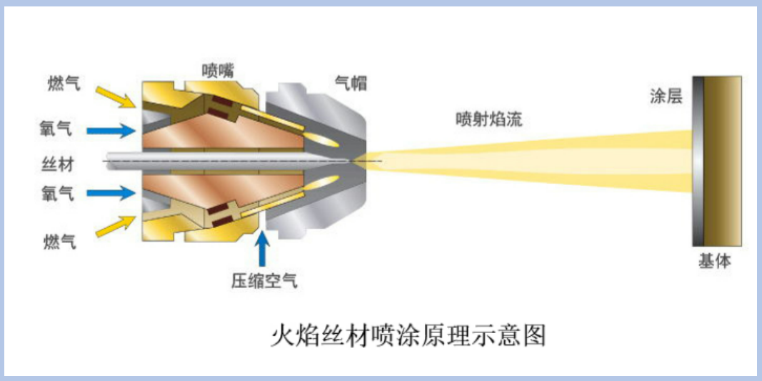火焰噴涂是以氧氣和燃氣(乙炔、丙烷、丙烯、天然氣或氫氣等)燃燒所產生的熱量來熔化噴涂材料并通過高壓氣體噴射至工件表面形成涂層的工藝?;鹧鎳娡坎牧系男问揭话阌腥N:粉材、絲材和棒材。粉材火焰噴涂較為普遍,能夠適用于多種零件和工況;絲材噴涂則常用于大規(guī)模的連續(xù)化作業(yè);而棒材則可以噴涂陶瓷材料,生產成本低廉但連續(xù)化作業(yè)難度較大。