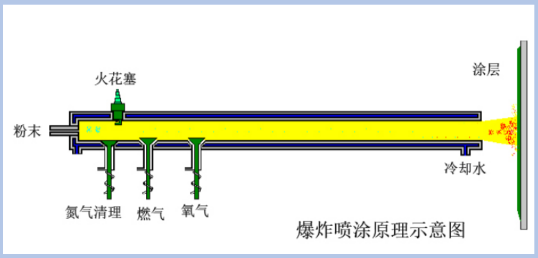 爆炸噴涂是在特殊設計得燃燒室內加入一定比例搭配的氧氣和燃氣,然后利用點燃混合氣體發(fā)生爆炸所產生強大的熱量和推力將粉末材料熔化后高速噴向工件表面的過程,每次噴射后通入氮氣流清洗槍管。爆炸噴涂由于其推力大、速度快,因此能夠實現(xiàn)涂層的高結合強度和低孔隙率。缺陷是爆炸畢竟是非持續(xù)性的間歇過程,因此想要噴涂均勻的涂層挑戰(zhàn)性蠻大。
