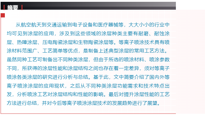 等離子噴涂是熱噴涂工藝的一種,其工作原理是利用等離子體焰流在短時(shí)間內(nèi)加熱并加速金屬或陶瓷粉末,在粉末為熔融或半熔融狀態(tài)下高速撞擊基體,形成以片層疊層狀態(tài)的涂層,這種涂層會(huì)牢固附著在基體表面,其結(jié)合方式主要以機(jī)械結(jié)合為主,有時(shí)也可產(chǎn)生微區(qū)冶金結(jié)合和物理結(jié)合。等離子噴涂工藝具有噴涂效率高、噴涂工件形狀尺寸不受限制、涂層厚度可控、涂層結(jié)合強(qiáng)度高且不影響基體性能等優(yōu)點(diǎn),通過等離子噴涂制備的防護(hù)涂層對(duì)提高基體的耐磨、耐蝕、耐熱等性能具有顯著效果。經(jīng)過幾十年不斷的發(fā)展,等離子噴涂技術(shù)已成為航空航天、汽車船舶等高端領(lǐng)域中進(jìn)行表面防護(hù)的一種重要表面處理工藝。近年來,隨著新材料的開發(fā),針對(duì)某些特定的噴涂材料,可通過等離子噴涂技術(shù)制備出使基體獲得特殊功能的涂層,如壓電涂層、吸波涂層和疏水涂層等,應(yīng)用領(lǐng)域涉及光伏、高鐵、雷達(dá)等眾多高新技術(shù)行業(yè)。同時(shí),利用等離子噴涂技術(shù)制備的生物陶瓷涂層,不僅可以提高基體的生物相容性,還可以起到一定的耐蝕、耐磨的防護(hù)作用,是醫(yī)用植入領(lǐng)域中必不可少的一道加工工序??傊?,等離子噴涂作為一種表面改性工藝,在該領(lǐng)域中占據(jù)著舉足輕重的地位,其制備的涂層不僅可以對(duì)基體起到防護(hù)作用,提高基體材料的工作使用強(qiáng)度,還能實(shí)現(xiàn)特殊材料在保留其特殊功能的前提下實(shí)現(xiàn)薄膜化、復(fù)雜化和小型化。經(jīng)過數(shù)年不斷地研究與實(shí)踐,等離子噴涂表面改性技術(shù)已日趨成熟,制備出的涂層也能夠滿足絕大多數(shù)領(lǐng)域的應(yīng)用需求,但由于涂層種類較多,不同種類的涂層從噴涂材料的選擇到噴涂工藝和參數(shù)的確定都略有差別,致使涂層結(jié)構(gòu)與性能之間存在巨大差異?;诖?,本文簡要介紹國內(nèi)外等離子噴涂制備不同種類涂層的研究現(xiàn)狀,通過從對(duì)不同種類涂層的工業(yè)需求和以及各涂層的技術(shù)特點(diǎn)出發(fā),綜述噴涂材料、噴涂工藝和噴涂參數(shù)對(duì)涂層結(jié)構(gòu)及性能影響,并對(duì)提升等離子噴涂不同涂層性能的方法進(jìn)行總結(jié),最后對(duì)等離子噴涂制備涂層技術(shù)進(jìn)行了展望。