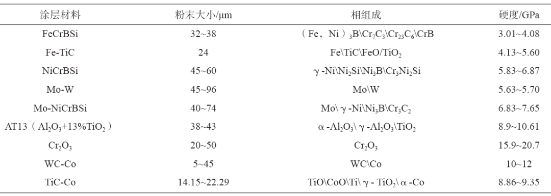 表1 常見等離子噴涂耐磨涂層材料及其相關(guān)參數(shù)