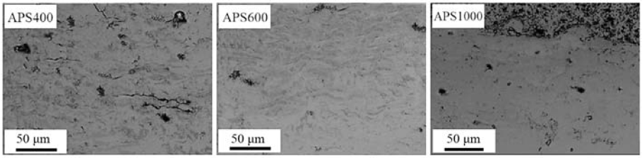 等離子噴涂耐磨涂層具有典型的層狀結(jié)構(gòu),其微觀結(jié)構(gòu)如圖2所示,涂層內(nèi)部和表面存在一定的孔隙、裂紋和部分未完全熔化組織。這些孔隙和裂紋的形成是由于不同熔融液滴之間的飛行速度和溫度不同,撞擊基體后呈現(xiàn)出不同的鋪展?fàn)顟B(tài),各層之間不能完整貼合而導(dǎo)致的,因此等離子噴涂涂層中的缺陷不可避免。研究表明,這些缺陷會(huì)直接影響涂層性能,比如在工作狀態(tài)下涂層中孔隙會(huì)因應(yīng)力集中而產(chǎn)生疲勞裂紋,經(jīng)過時(shí)間的積累,疲勞裂紋出現(xiàn)不斷擴(kuò)大,最終導(dǎo)致涂層出現(xiàn)分層而失效。通常認(rèn)為噴涂參數(shù)對(duì)涂層中孔隙和裂紋的大小及分布有較大影響。Gao Y等研究了在功率為2.5-4.0kW條件下Al2O3涂層孔隙率、硬度、及相組成的變化,通過選用內(nèi)部給粉的工藝在較低的功率下制備了高硬度的耐磨涂層,結(jié)果表明隨著噴涂功率的增加涂層硬度和γ-Al2O3相含量增加,孔隙率明顯降低,涂層硬度最高可達(dá)15GPa。Jiang X Y等研究了高焓大氣等離子噴涂功率和進(jìn)粉速率對(duì)Al2O3涂層組織結(jié)構(gòu)和性能之間的關(guān)系,結(jié)果表明降低噴涂功率或增加送粉速度均會(huì)提高涂層中未熔顆粒的含量,使涂層致密度降低,孔隙數(shù)量增加。而當(dāng)功率較大時(shí),粉末出現(xiàn)過熱或氣化,甚至發(fā)生相變的現(xiàn)象,使涂層中的硬質(zhì)相含量降低,并降低涂層硬度。對(duì)比發(fā)現(xiàn),后者的噴涂功率范圍在55kW-95kW明顯高于前者,但這兩種噴涂方法制備的涂層孔隙含量均低于2%,主要原因在于前者使用了內(nèi)部送粉的工藝,這種工藝使傳輸?shù)椒勰┑哪芰扛哂趥鹘y(tǒng)的噴涂方法。內(nèi)部送粉工藝消耗的能量雖然僅為傳統(tǒng)噴涂的1/5,但效率較低,無法實(shí)現(xiàn)大規(guī)模批量生產(chǎn),而高焓大氣等離子噴涂能使粉末完全充分熔化,獲得的涂層致密度高,現(xiàn)已成為高熔點(diǎn)陶瓷涂層的一種理想噴涂技術(shù)。