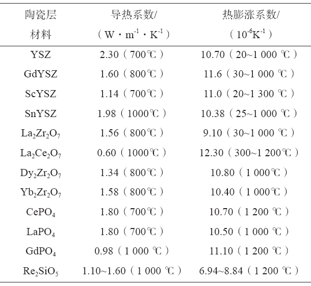 熱障涂層(Thermal barrier coatings,TBCs)是應(yīng)用在航空發(fā)動(dòng)機(jī)的渦輪葉片、燃燒室壁、尾噴管等高溫環(huán)境下的一種防護(hù)涂層。與傳統(tǒng)防護(hù)涂層結(jié)構(gòu)不同,熱障涂層通常由一層金屬粘結(jié)層和一層陶瓷隔熱層組成,有時(shí)也加入氧阻擋層、封閉層、梯度層形成多層結(jié)構(gòu)或梯度結(jié)構(gòu)等,其結(jié)構(gòu)圖如圖5所示。熱障涂層中粘結(jié)層主要起到緩解陶瓷層與基體之間熱膨脹系數(shù)不匹配的作用,改善兩者之間的物理相容性,而最為主要的陶瓷層則直接面對(duì)外部高溫環(huán)境,需要具有低熱導(dǎo)率、高膨脹系數(shù)和高熱穩(wěn)定性。目前最為常用的陶瓷層材料是YSZ,但1200℃是這種材料的使用極限,當(dāng)溫度超過極限溫度后,ZrO2會(huì)發(fā)生相變,導(dǎo)致涂層產(chǎn)生一定的膨脹,影響涂層的使用。近年來開發(fā)適用于熱障涂層的新型陶瓷層材料主要有YSZ、GdYSZ、La2Zr2O7、CePO4等,涂層具體物理參數(shù)見表2。從表中材料名稱中可以看出,熱障涂層陶瓷材料主要可分為稀土摻雜YSZ、稀土摻雜鋯酸鹽、以及稀土磷酸鹽、稀土硅酸鹽等。稀土摻雜YSZ材料使用溫度明顯高于傳統(tǒng)的YSZ材料,這是因?yàn)閾诫s稀土氧化物增大了ZrO2的晶格畸變,使晶格熱振動(dòng)頻率降低,涂層熱膨脹系數(shù)在原來基本保持不變的情況下,導(dǎo)熱率降低。