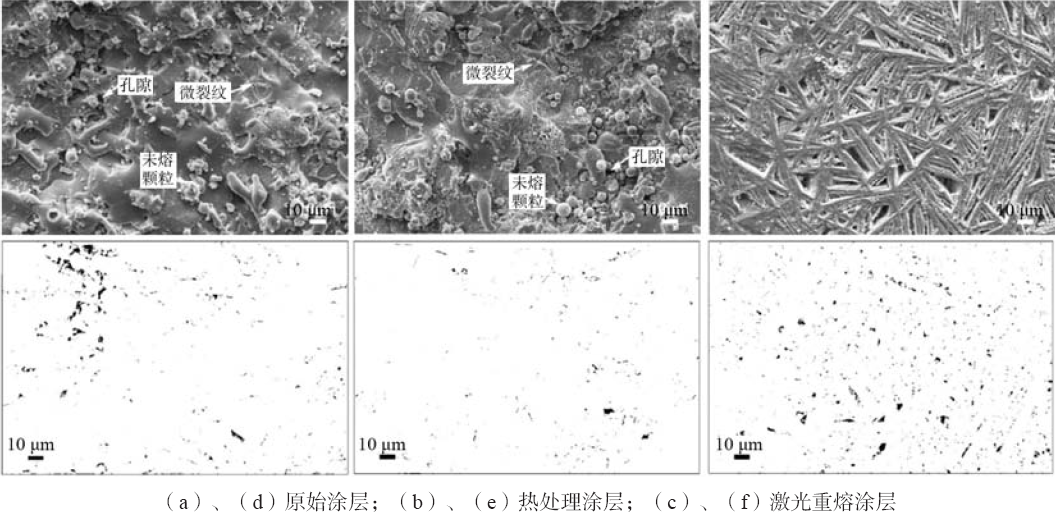 生物陶瓷涂層是專門用于醫(yī)用植入體的一種防護(hù)涂層,由于植入材料的植入周期較長,在其服役期間需要涂敷一層涂層來保護(hù)基體完整性不受體液或血液的侵蝕。因此生物活性涂層不僅需要具有生物相容性,還應(yīng)具有較高的結(jié)合強(qiáng)度、耐磨性和耐腐蝕性能,有時(shí)作為承力的植入體還需要涂層具備一定的力學(xué)性能。羥基磷灰石[Ca10(PO4)6(OH)2]簡稱HA,具有無毒、良好的生物相容性以及骨導(dǎo)電性,是目前制備生物陶瓷涂層最為常用的一種材料。但HA陶瓷材料脆性高、硬度大,通過等離子噴涂制備的羥基磷灰石陶瓷層常常面臨涂層與基體結(jié)合強(qiáng)度低、孔隙和裂紋等缺陷較多、涂層耐蝕性較差等問題。解決等離子噴涂生物陶瓷涂層的上述問題也主要通過優(yōu)化噴涂工藝、噴涂材料以及涂層的后處理等來解決。HuangL P等在鈦合金表面制備了等離子噴涂HA/Ta復(fù)合涂層,利用Ta與HA的熔點(diǎn)差異,使涂層中未熔化的Ta顆粒填充了HA涂層表面及內(nèi)部的氣孔,提高涂層致密度。同時(shí)Ta的加入也削弱了涂層和鈦合金之間的熱膨脹系數(shù)的失配度,提高了涂層與基體的結(jié)合強(qiáng)度。此外Ta也具有很好的抗菌性能,有效減少組織感染的發(fā)生。優(yōu)化噴涂材料也可以減少涂層內(nèi)部缺陷提高涂層耐蝕性。Singh J等研究了硅酸鈣增強(qiáng)羥基磷灰石(HA-CS)涂層和HA涂層,對(duì)比發(fā)現(xiàn)純HA涂層表面存在一定的微裂紋,而HA-CS涂層上無明顯的裂紋,且隨著CS含量的提高,涂層的耐蝕性得到了提高。這是因?yàn)樵贖A涂層的凝固過程中只存在快速均勻的單相冷卻,而HA-CS涂層中,HA和CS的熱導(dǎo)率不同,會(huì)產(chǎn)生跨HA/CS邊界的溫度梯度,使HA-CS涂層的冷卻速度減慢,減少裂紋的產(chǎn)生。等離子噴涂熱流溫度高,HA材料在等離子噴涂后會(huì)產(chǎn)生明顯的分解、非晶化、失羥等現(xiàn)象。通常非晶相在熱力學(xué)上處于亞穩(wěn)定,是容易發(fā)生分解和失效的,因此對(duì)涂層進(jìn)行晶化處理,提高涂層中HA晶相比例,可以提高涂層的結(jié)構(gòu)穩(wěn)定性。劉晉京研究了熱處理和激光重熔對(duì)等離子噴涂涂層組織和結(jié)構(gòu)的影響,結(jié)果表明噴涂過程中HA發(fā)生了分解和非結(jié)晶化,經(jīng)過處理后涂層顯微結(jié)構(gòu)和孔隙含量如圖7所示,HA結(jié)晶度明顯提高,表面質(zhì)量較好,孔隙含量均低于初始涂層。
