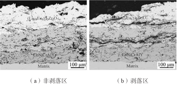 熱障涂層的服役環(huán)境十分惡劣,除相變以外,陶瓷層的殘余應(yīng)力以及高溫環(huán)境對(duì)陶瓷層的熱腐蝕等都會(huì)使涂層出現(xiàn)剝落提前失效。熱腐蝕是熱障涂層所面臨的嚴(yán)肅問題,在發(fā)動(dòng)機(jī)的燃料中,大量的Na、V、S等元素在高溫環(huán)境下會(huì)破壞涂層的內(nèi)部結(jié)構(gòu),加速涂層的失效。以YSZ涂層為例,熱腐蝕的發(fā)生是氧化釔與腐蝕鹽發(fā)生的化學(xué)反應(yīng),生成新的化合物,消耗了YSZ中Y2O3的含量的同時(shí),會(huì)使YSZ產(chǎn)生一定的相變,相變應(yīng)力的產(chǎn)生會(huì)加速涂層內(nèi)部裂紋的擴(kuò)展。熱腐蝕是涂層結(jié)構(gòu)發(fā)生破壞的起因,而殘余應(yīng)力則是陶瓷層發(fā)生剝落的主要原因,研究認(rèn)為陶瓷層的剝落并不是界面上的突然開裂,而是殘余應(yīng)力誘發(fā)涂層沿厚度方向上的開裂。熱障涂層中的殘余應(yīng)力主要來源于三方面,一是在等離子噴涂過程中熔融液滴冷卻過程中所產(chǎn)生的的熱應(yīng)力;二是熱障涂層在經(jīng)過熱循環(huán)后冷卻時(shí)因熱膨脹系數(shù)不匹配而產(chǎn)生的熱應(yīng)力;三是粘結(jié)層在經(jīng)過熱循環(huán)氧化后所產(chǎn)生的高溫生長應(yīng)力。對(duì)于第一種應(yīng)力前文已說明采用預(yù)熱基體并優(yōu)化噴涂參數(shù)可降低噴涂過程中的殘余應(yīng)力,對(duì)于后兩種殘余應(yīng)力,可利用雙層陶瓷層結(jié)構(gòu)的方法來解決。Ma W等采用大氣等離子噴涂技術(shù)制備了La2CeO7/8YSZ雙層陶瓷熱障涂層,與單獨(dú)的La2CeO7和8YSZ涂層相比,這種雙層陶瓷涂層的設(shè)計(jì)有效地克服了La2CeO7涂層與結(jié)合層之間的熱膨脹失配,在高溫循環(huán)條件下其壽命比單獨(dú)的La2CeO7和8YSZ涂層得到明顯提高。類似的,Liu Z G等制備了雙層(La0.8Eu0.2)2Zr2O7/YSZ,熱循環(huán)試驗(yàn)后涂層部分區(qū)域出現(xiàn)剝落。涂層剝落區(qū)與非剝落區(qū)的微觀形貌如圖6所示,長條狀裂紋大多發(fā)生在兩種陶瓷層之間以及YSZ涂層內(nèi)部,涂層的損傷主要發(fā)生在外表面的陶瓷層上,而結(jié)合層上的熱生長氧化層并不明顯,說明這種結(jié)構(gòu)的涂層可以有效延緩?fù)繉拥膿p壞。雙層陶瓷結(jié)構(gòu)中,上層陶瓷層具有低導(dǎo)熱系數(shù)和高相穩(wěn)定性,可起到保溫和保護(hù)內(nèi)層的作用,這種雙層陶瓷結(jié)構(gòu)在新型熱障涂層研究中表現(xiàn)出良好的發(fā)展?jié)摿Α?